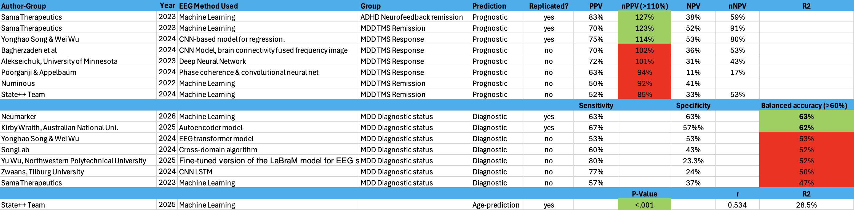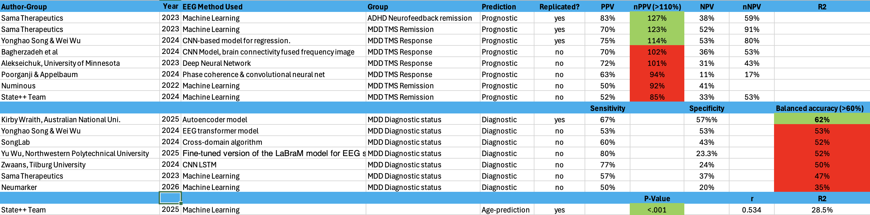The goal is to develop clinically actionable biomarkers, that should generalize to ‘unseen’ data, so we have marked 30% of clinical and treatment outcome data as REPLICATION. These are blinded for prospective validation and replication purposes. Interested researchers can share (This email address is being protected from spambots. You need JavaScript enabled to view it.) their diagnostic or treatment-outcome predictions on these REPLICATION data with us, so we can perform a ‘blinded out-of-sample’ validation for them, and post the results on this page, so that reviewers for journals can also consult this independent validation of their algorithms. Conversely, reviewers or editors faced with ‘too good to be true’ claims, can refer researchers to this resource, to perform validations and share them with us for verification and publication. We hope this will accelerate the discovery and validation of clinically actionable biomarkers that we hope will soon benefit patients and improve psychiatric and neurological care in the clinic.